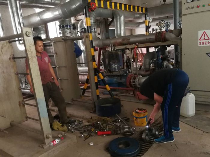 第一站為運營二所儲運熱力站,站內(nèi)一派忙碌的檢修景象,檢修人員正在拆解75KW循環(huán)泵。據(jù)運營二所檢修助理尚帥介紹,此臺循環(huán)泵于2005年投入使用,運行期間,可供儲運小區(qū)、會計學校、煤炭大廈、以及中華家園一期等居民用熱。在拆解過程中發(fā)現(xiàn)循環(huán)泵電機線包有燒焦處并且發(fā)黑,電機端蓋也磨損嚴重。副經(jīng)理劉強仔細查看,囑咐二所人員針對老、舊設(shè)備工況應及時采購更換以保證冬季采暖期熱用戶的用熱保障。隨后,前往運營三所恒大G區(qū)熱力站進行安全檢查,站內(nèi)檢修人員正在清洗除污器。