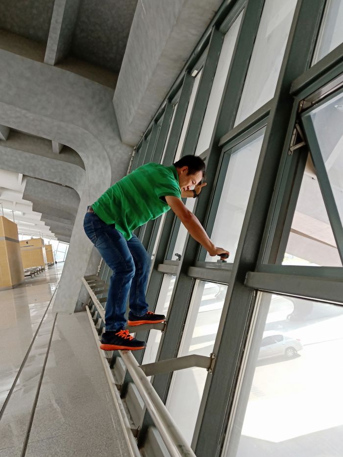 主站樓部分是攻堅之戰(zhàn),30位員工在透明的頂棚下感受悶熱灼曬、揮汗如雨,每一塊地磚都是經(jīng)過了水沖、塵推、除塵、清洗、抹凈、擦干等六道工序,方可達(dá)標(biāo)。上下兩層共26912平方米,經(jīng)過兩天半的時間終于完工,看著光亮如新、纖塵不染的候車廳,所有員工的臉上都綻放了發(fā)自內(nèi)心的微笑。