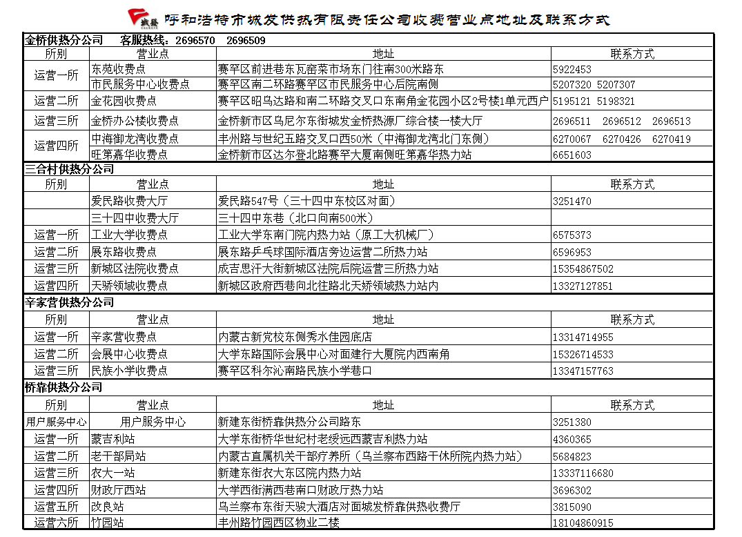 城發(fā)供熱公司收費營業(yè)點地址及聯系方式
